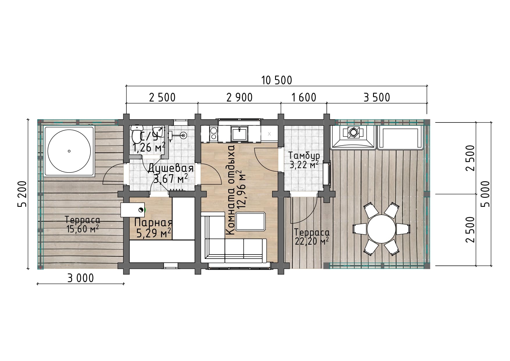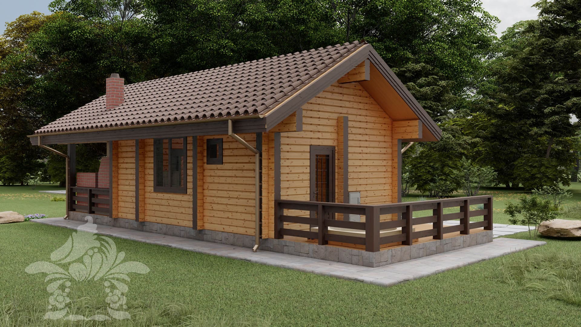 Загородная баня из клееного бруса в современном дизайне с двумя красивыми террасами, уличной джакузи, обеденным столом и кирпичной печью-барбекю. В бане есть всё необходимое для семейного отдыха, либо приятного времяпровождения компании друзей: парилка на дровах, моечное отделение с санитарной зоной, комната отдыха с кухней и вторым светом, тёплый тамбур.