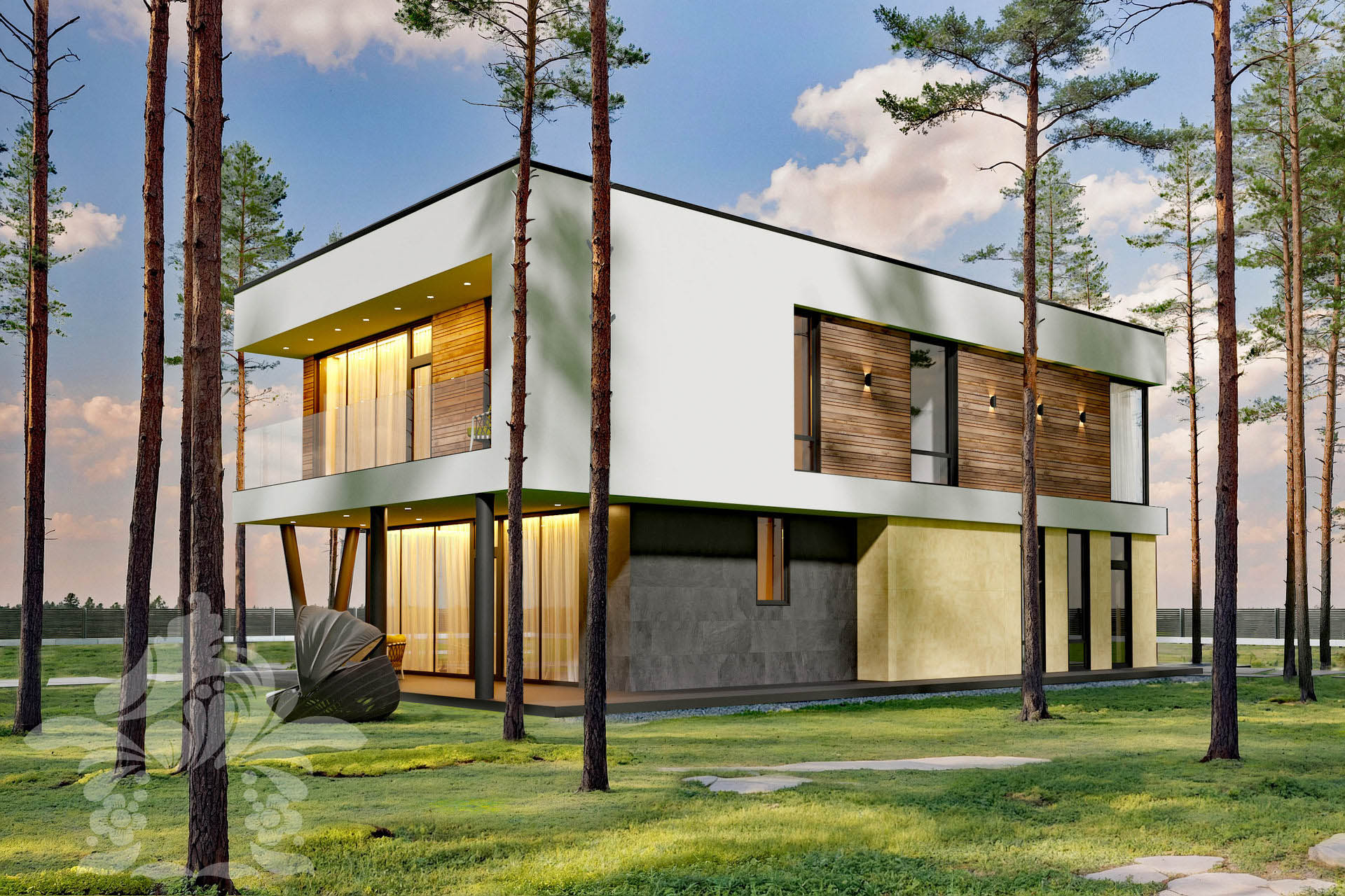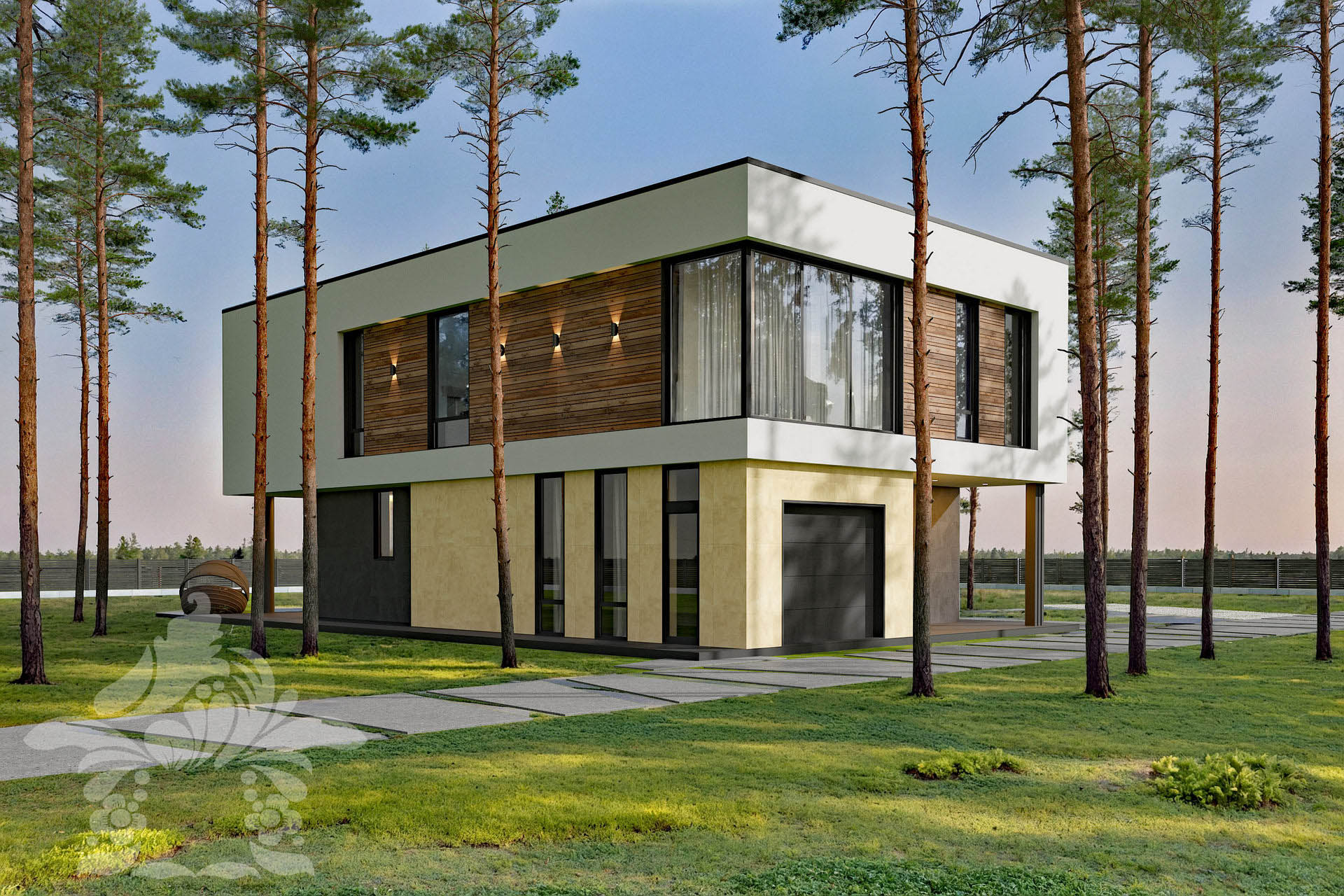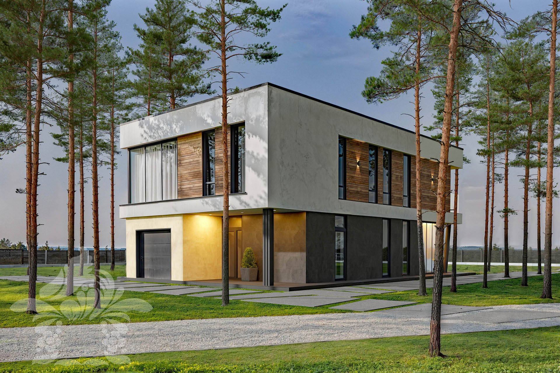 В проекте: кухня-гостиная со столовой, 4 спальни с санузлами и гардеробными, гостевая комната, встроенный гараж, большая терраса, технические и вспомогательные помещения.