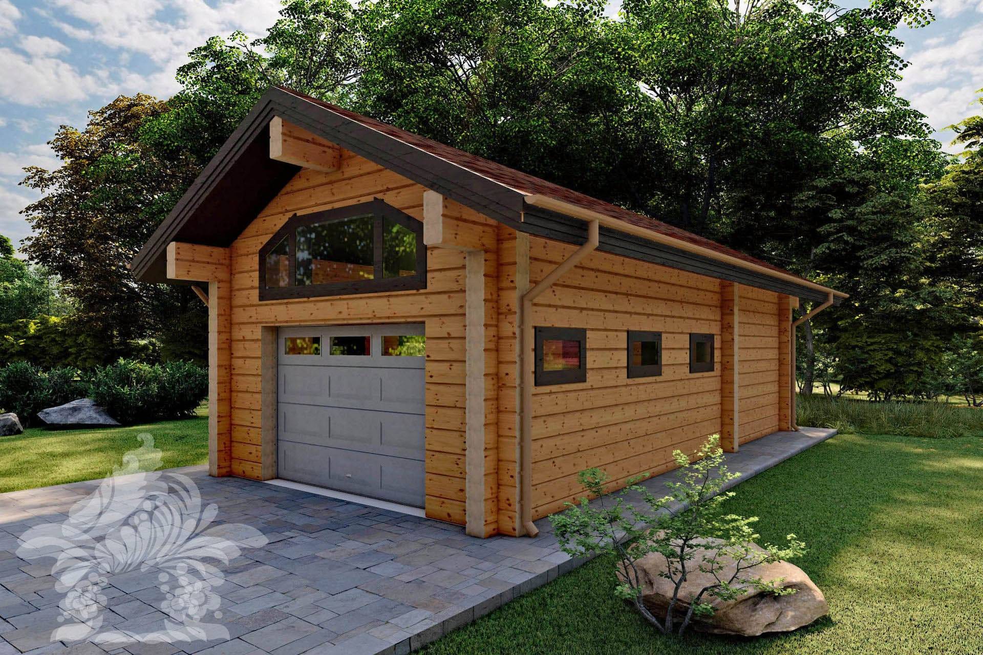 Отдельно стоящий гараж, спроектированный в одном стиле с жилым домом по проекту Юрово, рассчитанный на бережную парковку машины. Секционные ворота с подъемным механизмом, хоз.блок-мастерская со шкафами и стеллажами, санузел с отдельным входом с улицы.